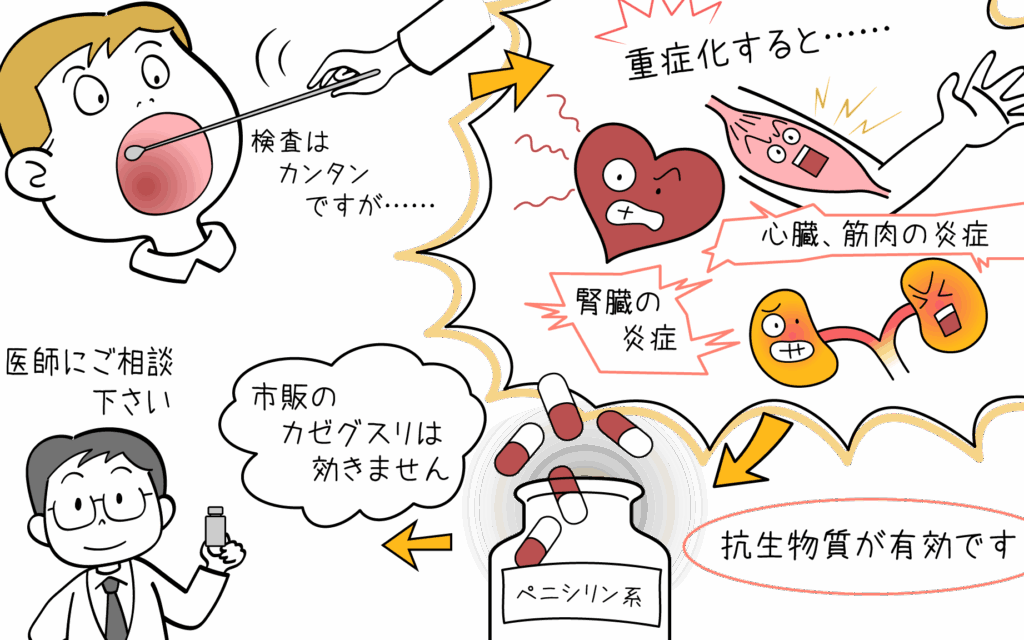 - 症状: よく知られる症状に、のどの痛み、発熱、頭痛が含まれます。皮膚感染の場合、発赤や発疹が伴うこともあります。