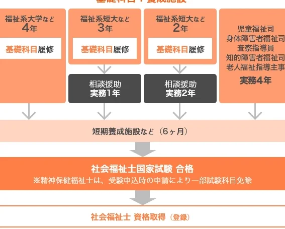 - 社会福祉士養成課程を修了すること。大学での4年間の教育が必要です。