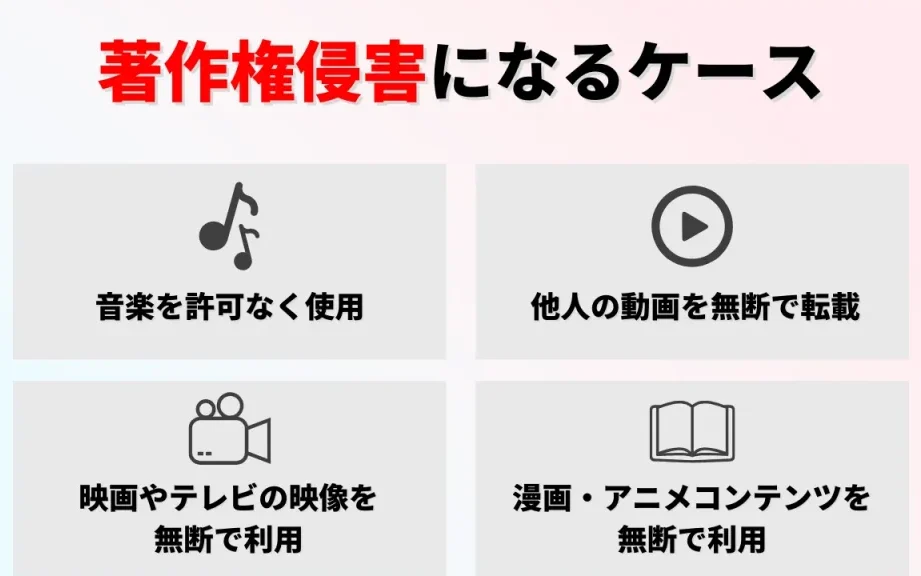 - 音楽の無断使用: 他人の楽曲を動画に使った場合、著作権侵害となる。