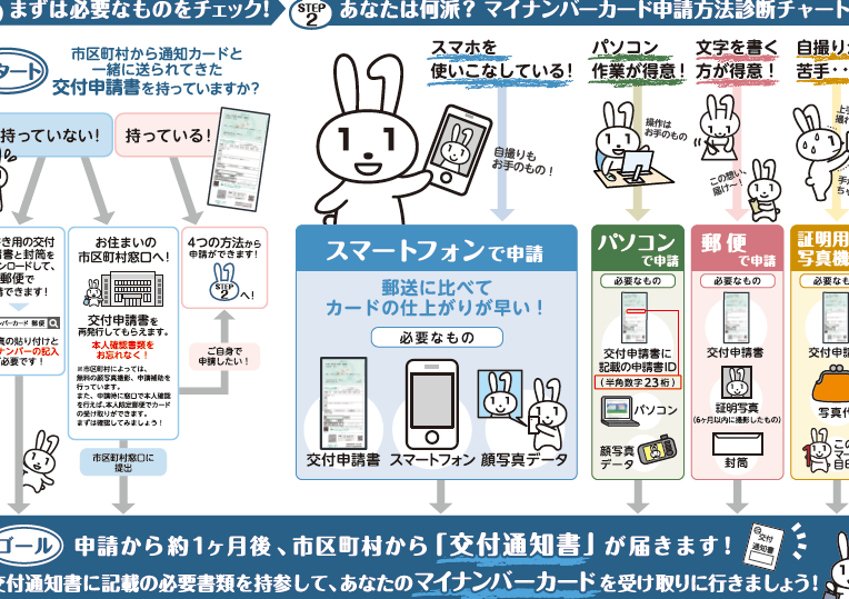 以下のステップで、マイナンバーカードの取得方法について説明します。