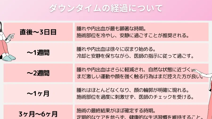 手術後、回復には通常数週間かかります。また、腫れや痛みが伴うことがあり、これらは時間と共に改善します。しかし、術後のケアを怠らないことが重要です。この手術を受ける際に気をつけるべきことは以下の通りです。