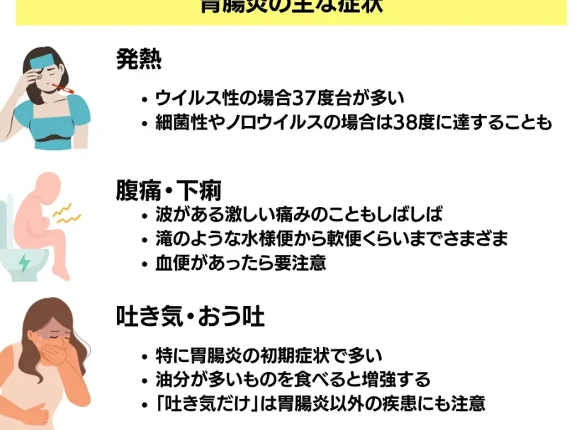 一般的に、胃腸炎の症状には次のようなものがあります: