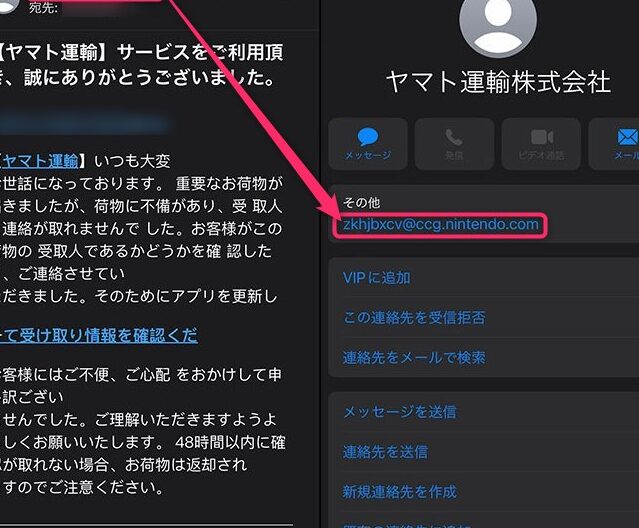 メールの差出人のアドレスが、公式のヤマト運輸のドメインであることを確認します。