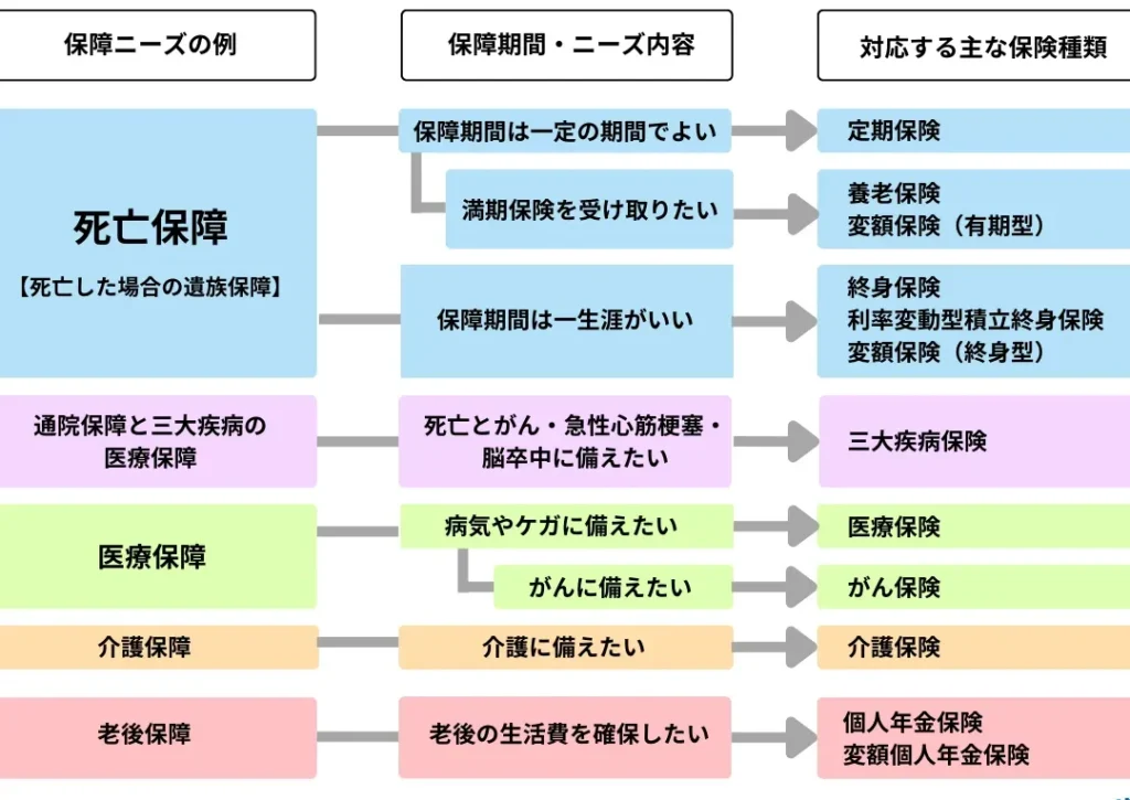 - 保険の目的を明確にする。家族の支援や教育資金、負債の返済など、生活設計に基づいて考えます。