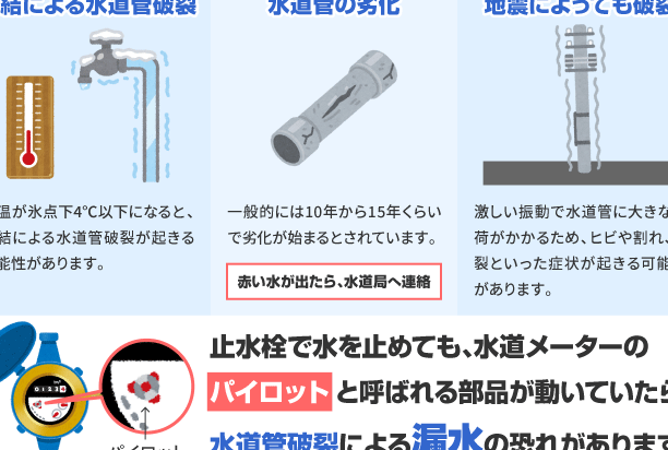 - 老朽化: 水道管の材質や年数が関与する。古い材料は劣化しやすい。