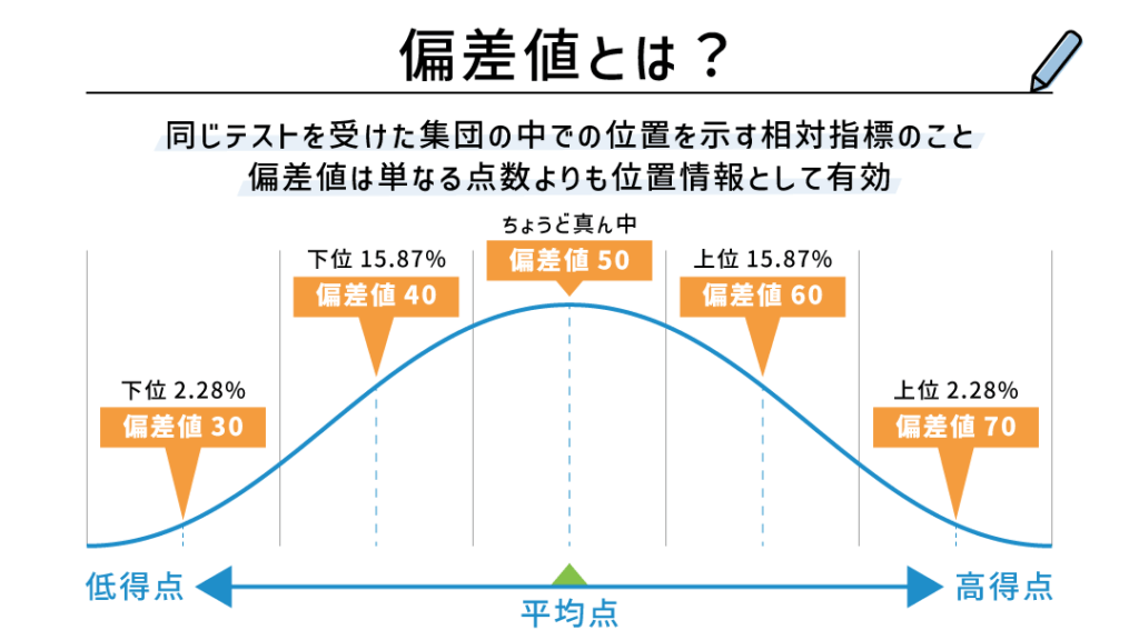- 競争力:偏差値は、同じ試験を受けた他の学生と比較した際の自分自身の立ち位置を示します。