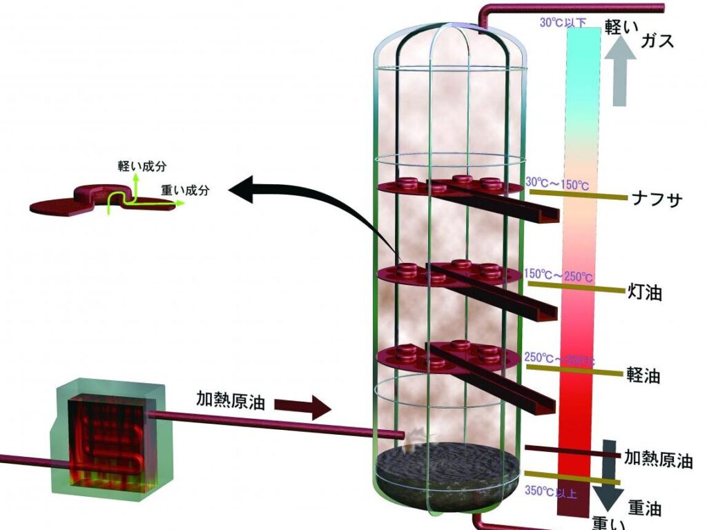 - 分留: 石油を加熱し、異なる沸点を持つ成分を分離します。この過程では、蒸気が上昇する際に冷却されて液体になり、それぞれ異なる物質が得られます。