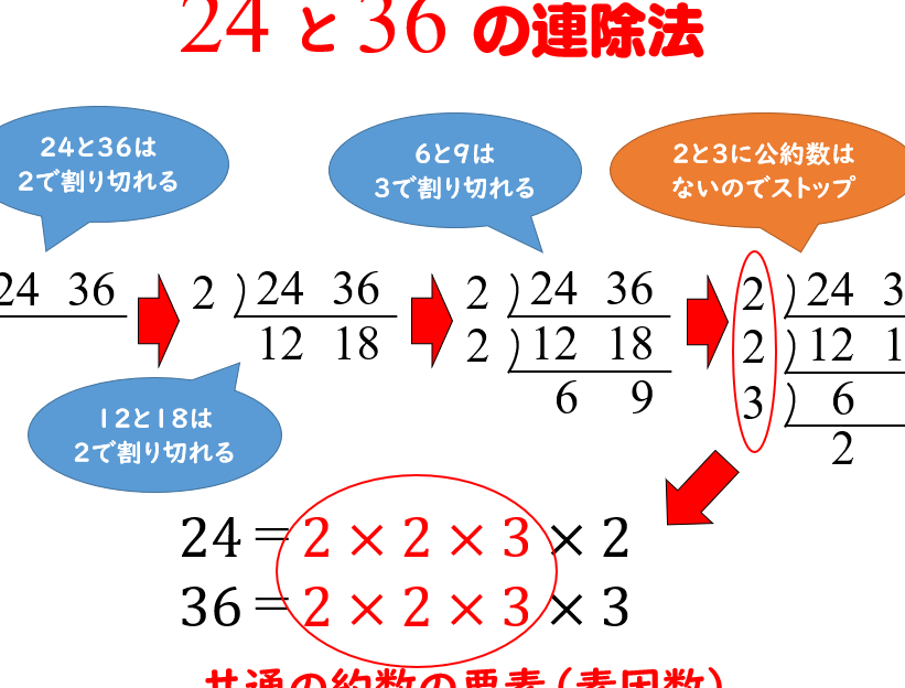 - 列挙法: 小さい数字から始めて、それぞれの因数を列挙し、一致するものを探す方法。