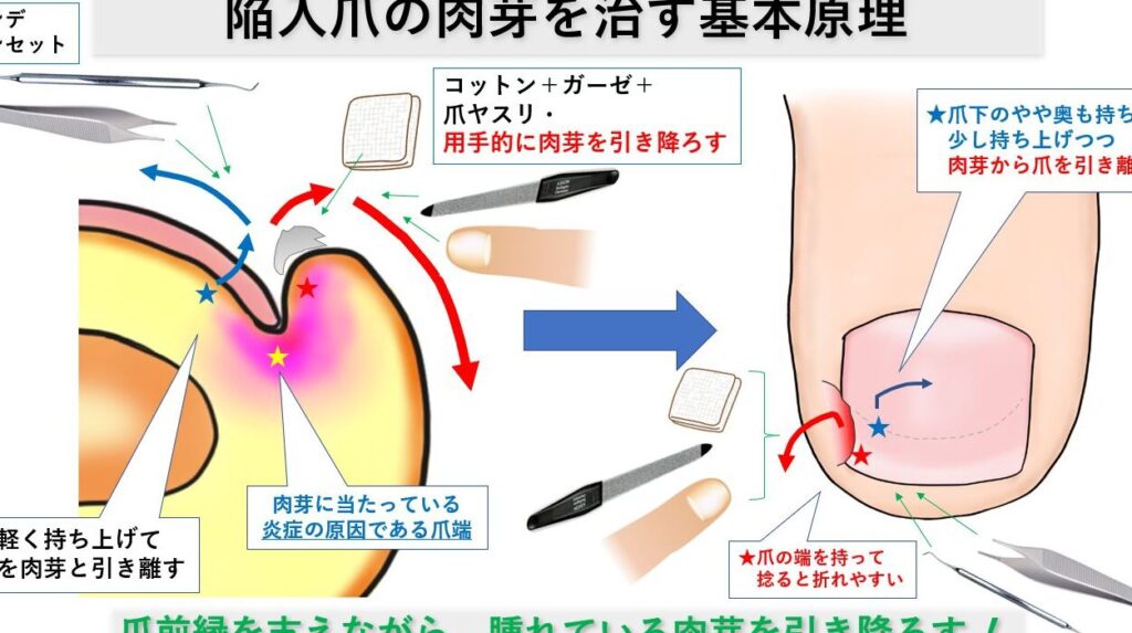 は、陥入爪を予防し、治療を促進するために非常に重要です。これらの要素が正しく行われることで、足元の健康を守り、さらなる問題を避けることができます。それでは、それぞれについて詳しく見ていきましょう。