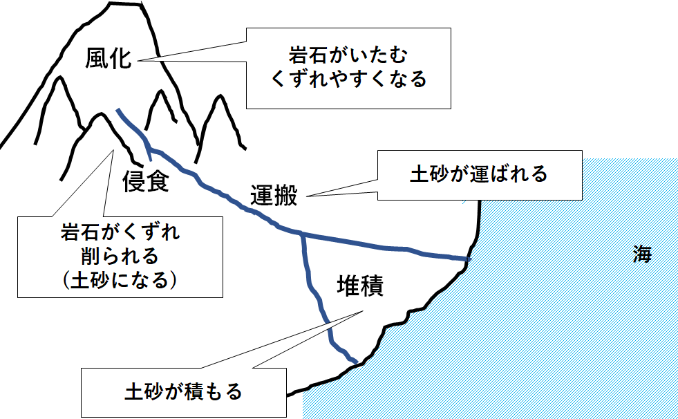 - 風化: 地表面が物理的または化学的に変化し、新しい土地形状を生み出す過程。