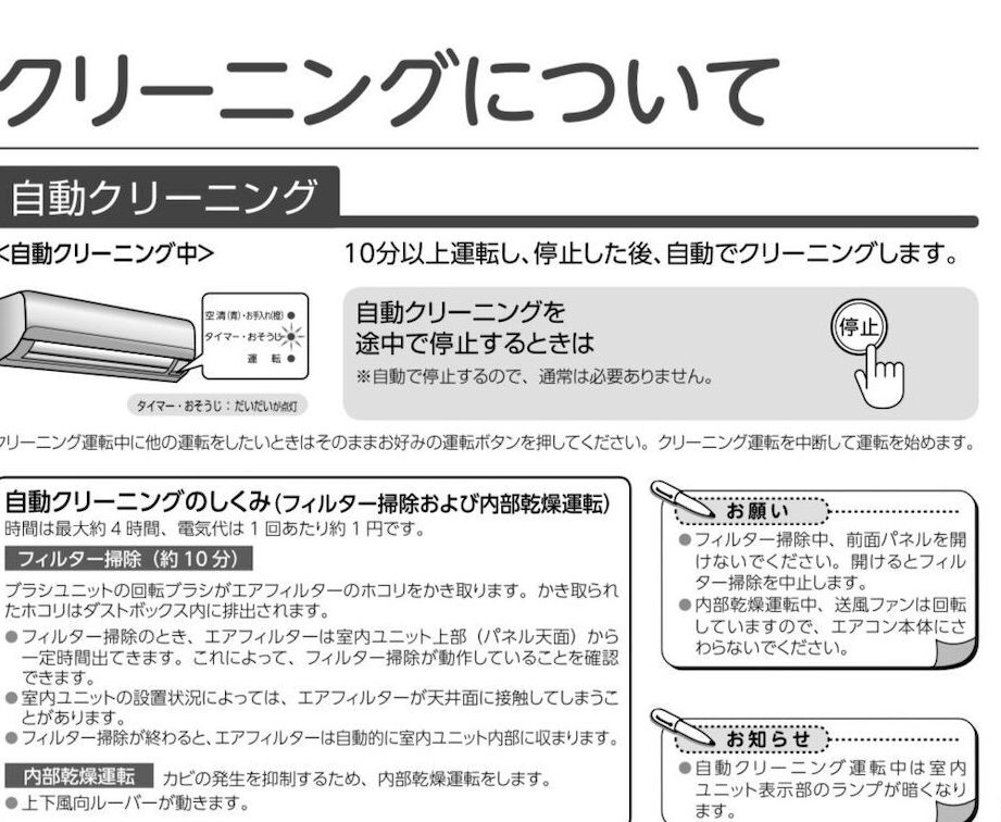 - 内部クリーニング: エアコン内部にほこりやカビなどが溜まっているときにも表示されます。