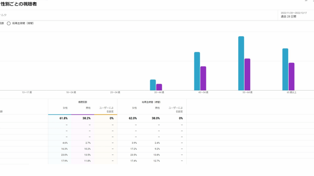 この表からもわかるように、それぞれの年齢層がどれくらい当チャンネルを視聴しているかが一目瞭然です。この情報は、私たちがどの世代向けにコンテンツを強化すべきか判断するためにも役立ちます。