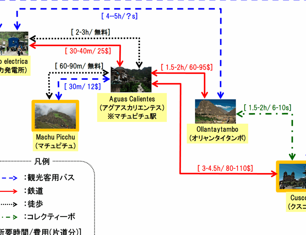 | 列車(クスコからアグアスカリエンテス) | 約3.5〜4時間 |