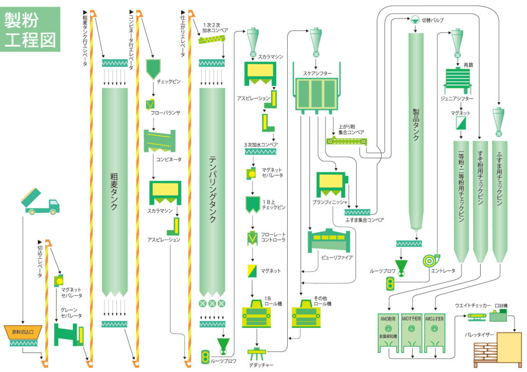 このプロセス全体では、各ステップごとに厳密な監視と調整が求められ、高品質な小麦粉が生産されます。