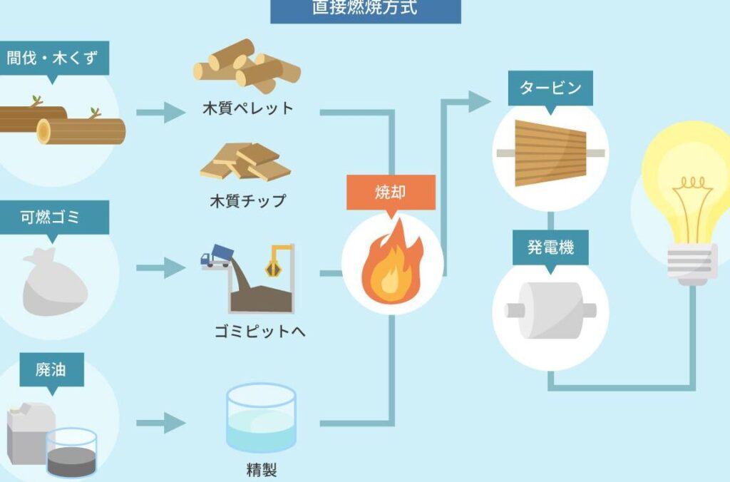 - 熱化学プロセス:高温条件下で燃焼またはガス化し、熱エネルギーを得る。
