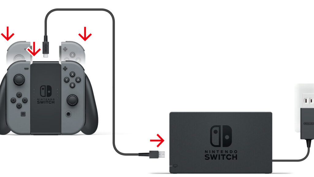 - スイッチ本体をドックにはめ込みます。これによって、自動的にコントローラーも充電されます。