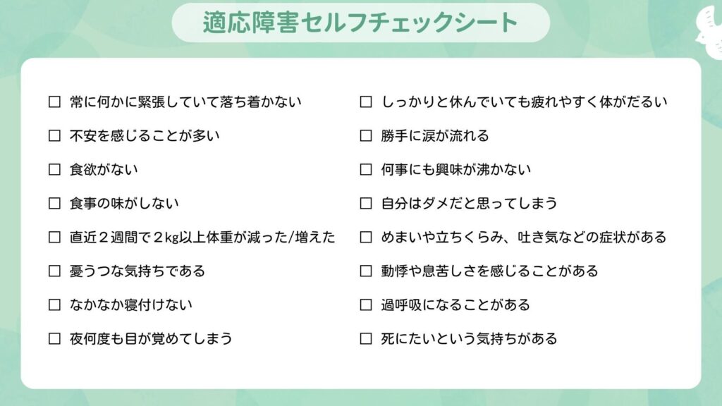 - 持続的な不安感: 日常生活で必要以上に不安になる状態は、適応障害へ繋がっている可能性があります。