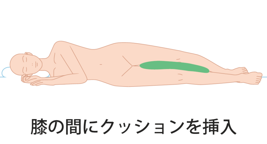- 体のラインが真っ直ぐになるように、肩と膝の間に枕を挟んでサポートします。