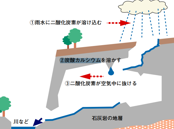 - 雨水の浸透: 雨が降ると、水分は地面に吸収され、地下へと浸透します。この過程で、水は二酸化炭素を取り込み、弱酸性の炭酸水となります。