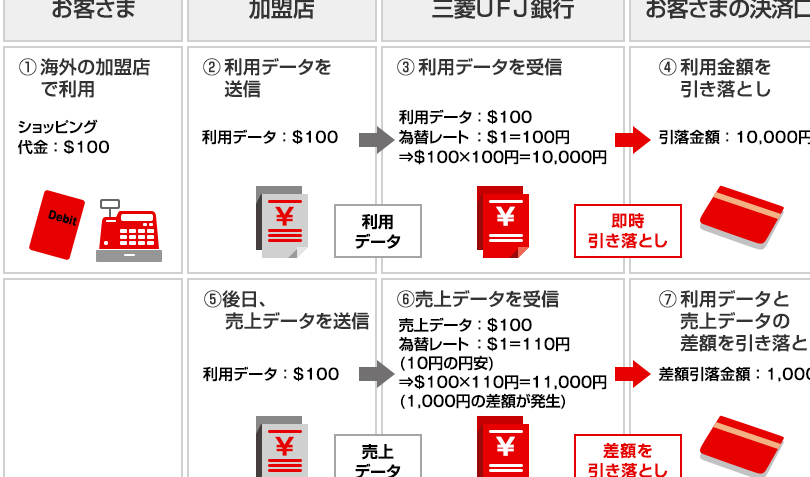 - デビットカードは即時決済されるため、残高不足の場合は取引ができません。