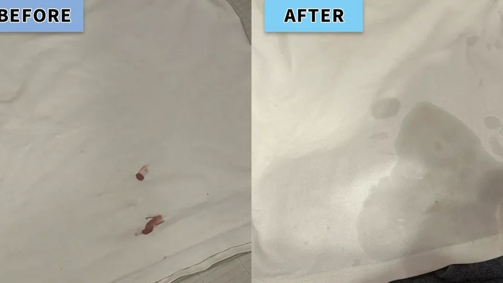 - 酢スプレー: 水と白酢(1:1)を混ぜたスプレー液体を作り、直接血液部分に吹きかけます。その後、柔らかい布で叩いて拭き取ります。
