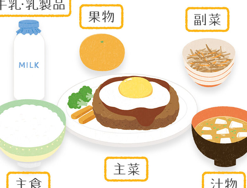 - 主菜・副菜・ご飯: 各々適切な割合で組み合わせる。