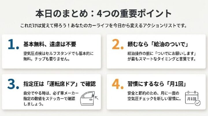 このようにして、私たちはセルフガソリンスタンドで効率よく空気圧点検を依頼できます。また、自信がない場合はスタッフに直接相談し、アドバイスを受けることもおすすめです。