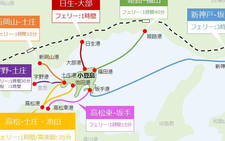 | 岡山観光汽船 | 宇野港(岡山) | 草壁港(小豆島) | 約70分 |