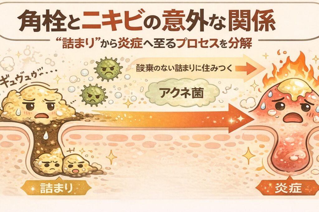 - アクネ菌増殖: 毛穴内では酸素不足となり、通常無害であるアクネ菌が異常に繁殖し始めます。この細菌は炎症を引き起こす原因となります。