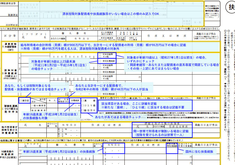 扶養家族がいる場合、その人数と関係性を確認し、正確に記入することが求められます。この情報は税額計算にも影響しますので注意しましょう。