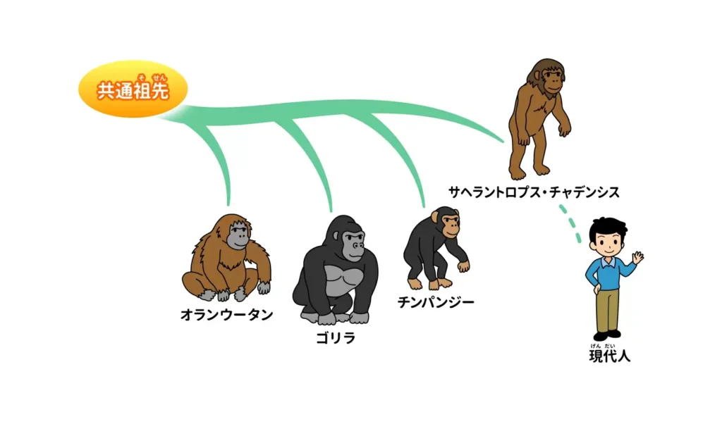 猿と人間は約600万年前に共通祖先から分岐したことが知られています。この共通祖先との関連性は、以下のような具体的な遺伝子配列によって示されています:
