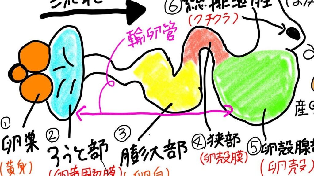 - 白身と膜生成: 卵管内で白身(アルブミン)や各種膜が形成されます。