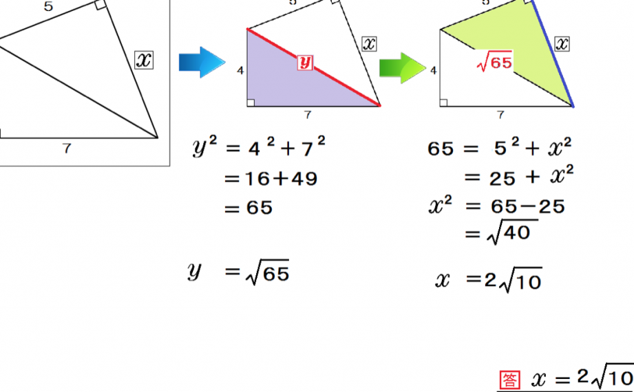 このようにして、「直角三角形の辺の長さはどうやって計算する?」という疑問への答えが得られるわけです。次に、この基本的な考え方を元に具体的な例題へと進んでいきましょう。