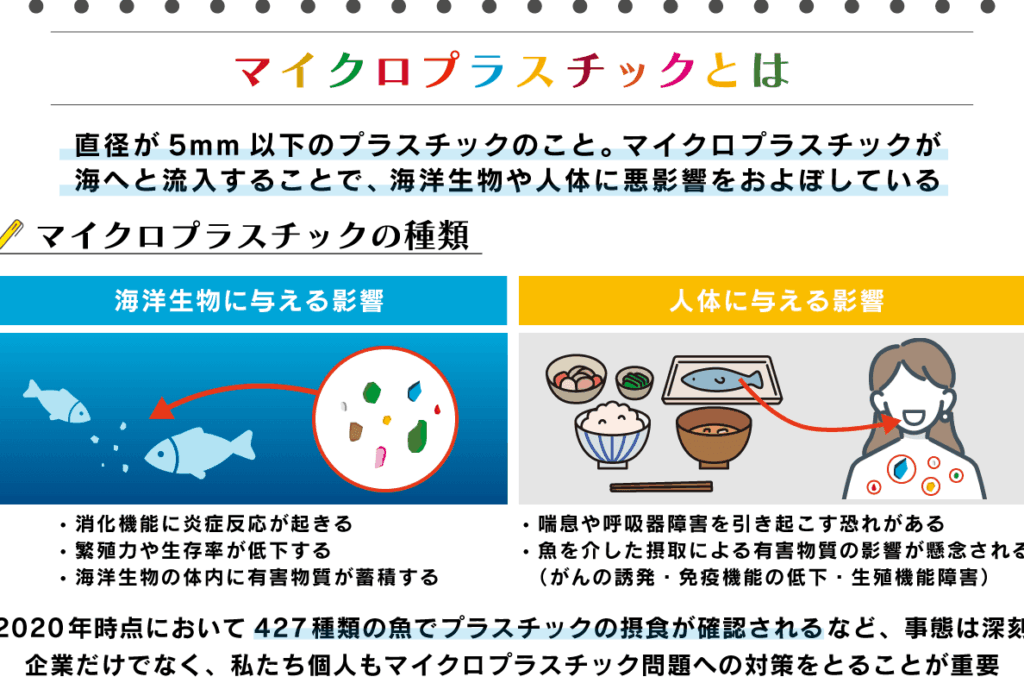 このようにして発生したマイクロプラスチックは、生態系への影響だけでなく、人間社会にも深刻な問題となっています。