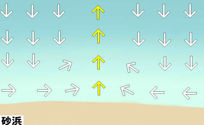- 逆流感: 海面で他と異なる速度で後退しているように見える箇所。また、周囲よりも明らかに早く沖へ向かう波を見ることで気づくことができます。