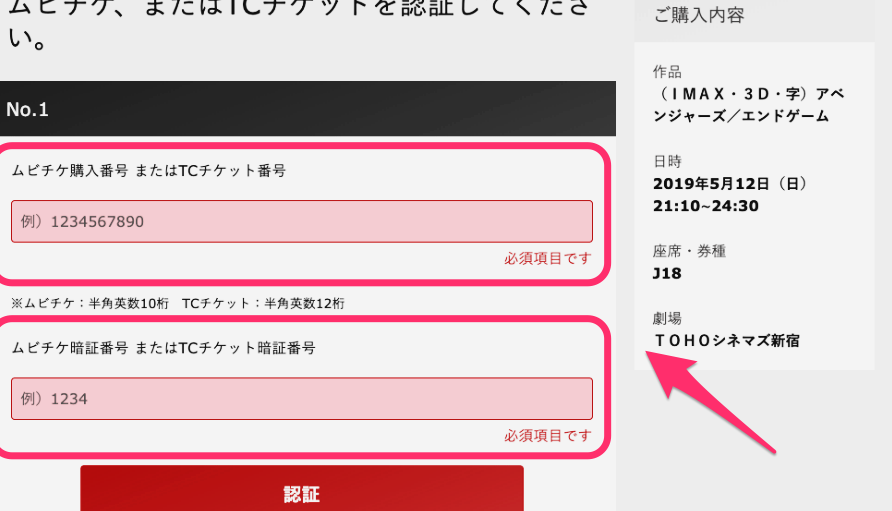 選んだ座席後は、自身の情報(名前や連絡先)及び支払い方法など必要事項を入力します。また、この際にムビチケ番号も忘れず記入してください。