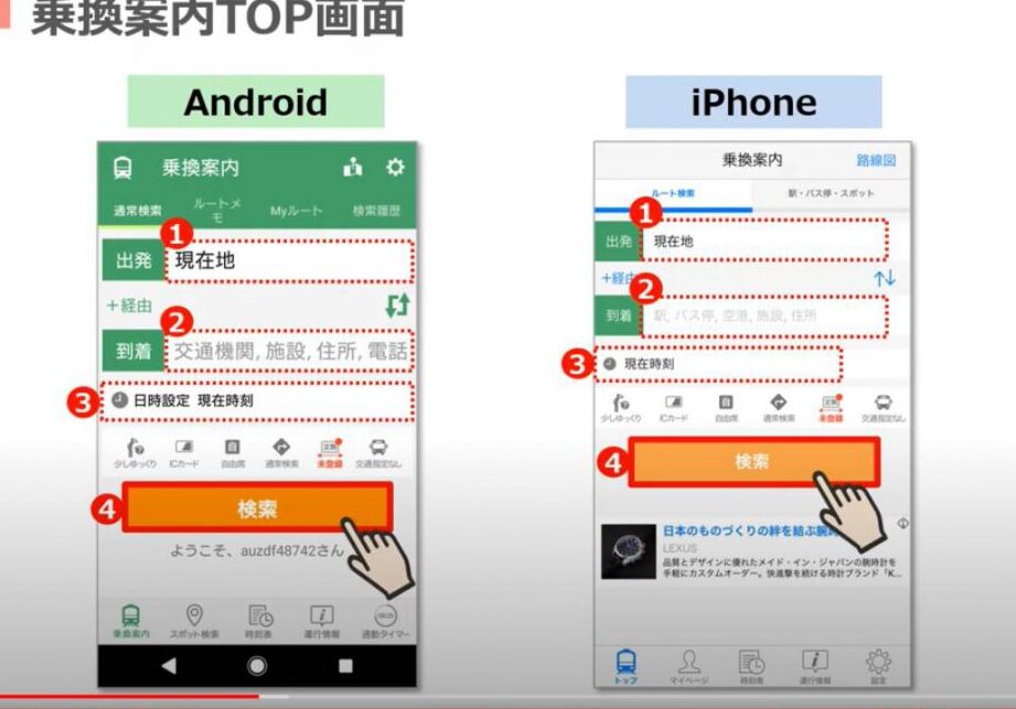 - 出発・到着地点設定: 出発駅と目的地を入力すると、自動的に複数パターンから選択できる。