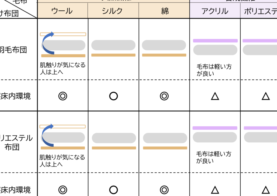 このように素材自体の特性を理解し、それに基づいて選ぶことが重要です。また、一部の毛布には異なる素材や織り方がありますので、これも上下を見分けるポイントになります。例えば、片面だけ起毛加工されている場合、その起毛された面が通常は肌に直接触れる部分として設計されています。
