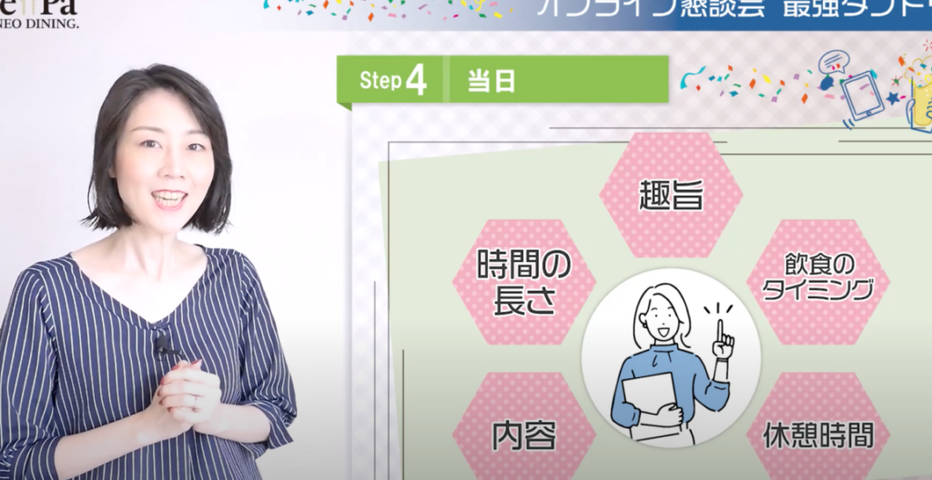 - 時間管理: 飲み会は楽しいですが、長時間になると集中力が途切れることがあります。適度な休憩時間を設けることで、全員が楽しめるよう配慮しましょう。