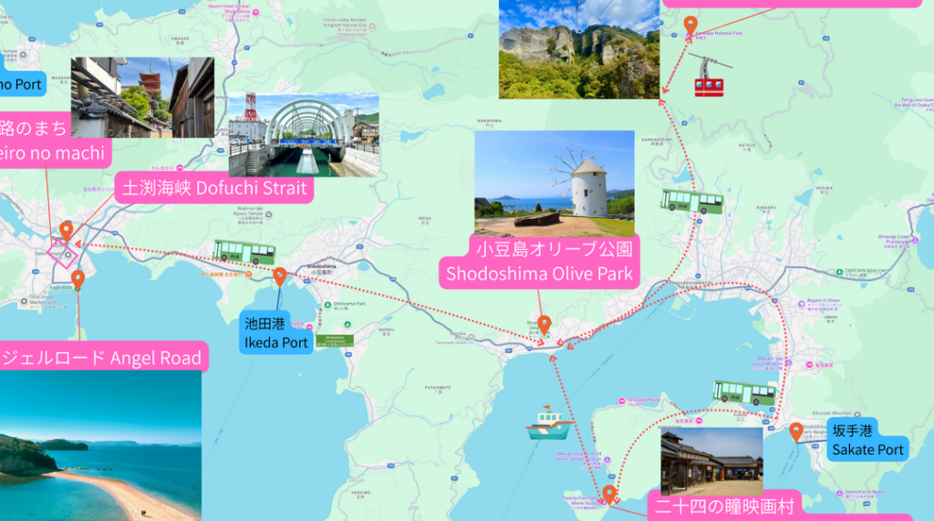 小豆島には魅力的な観光スポットが数多く存在します。これらのスポットへのアクセスを理解することで、よりスムーズに旅行を楽しむことができます。ここでは、特に人気のある観光名所とそれぞれへのアクセス方法について詳しく説明します。
