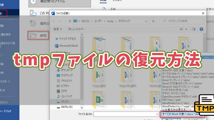 - 対象tmpファイルを指定する: ファイルダイアログで目的のtmpファイルを見つけて選択し、「開く」ボタンを押します。