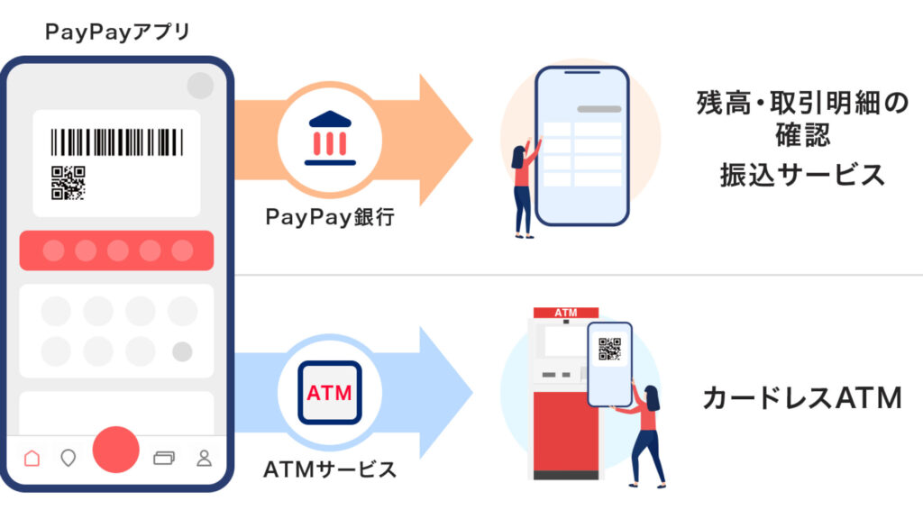 - QRコード読み取り: アプリ内で表示されるQRコードをATMでスキャンします。