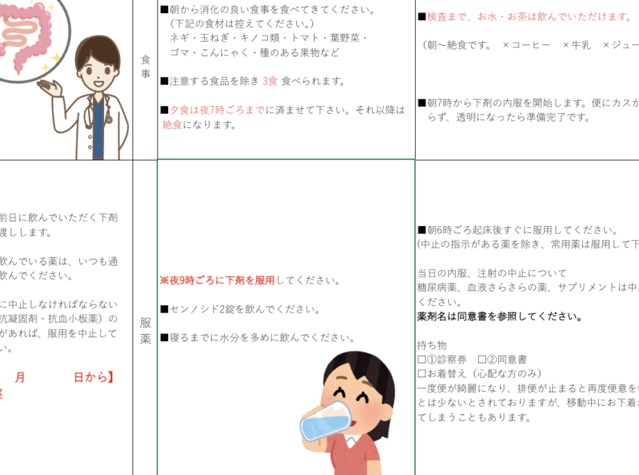 検査当日の朝には指定された下剤を服用します。このプロセスでは慎重さが求められますので、次の点も考慮してください: