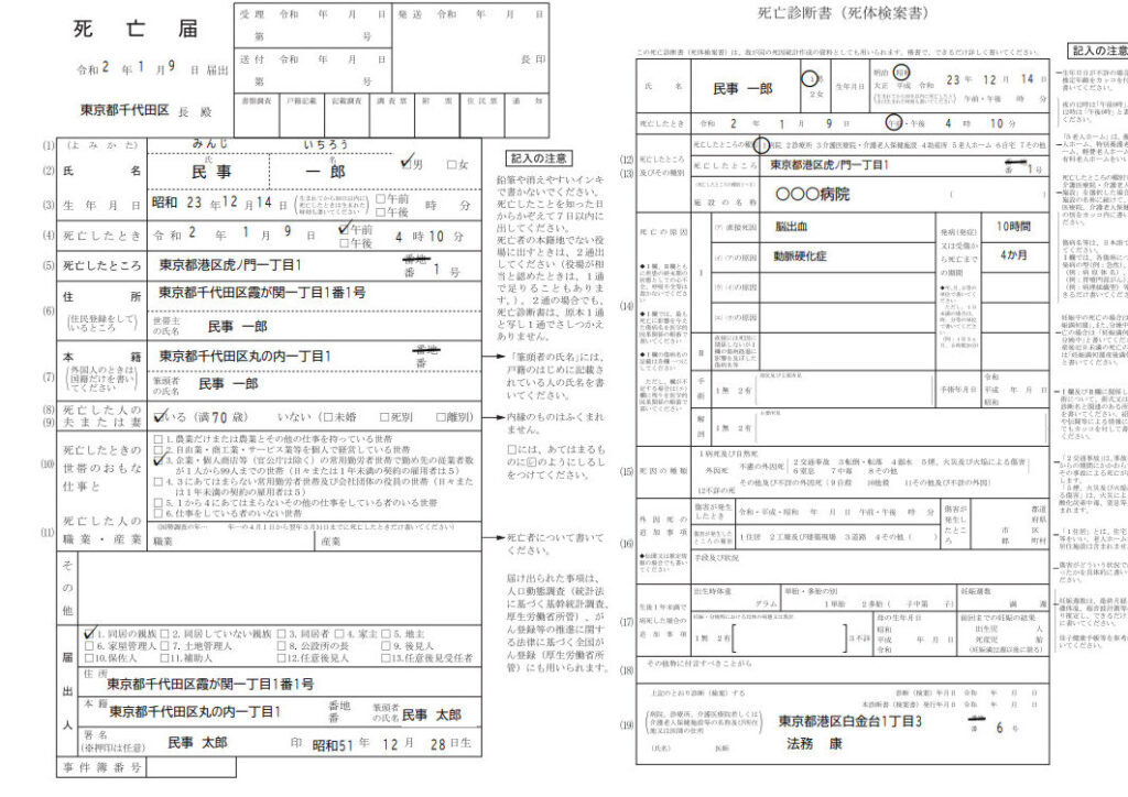医師による検査後、死亡が確認されると、その場で死亡診断書が発行されます。一般的には以下の情報が記載されています。