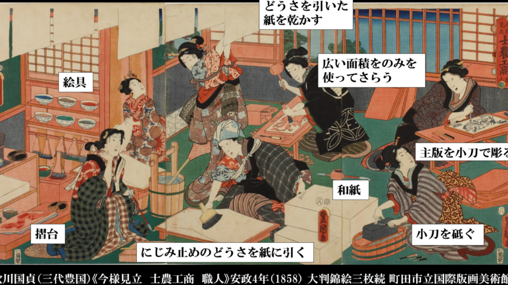 最後は印刷工程です。ここでは先ほど彫った木版とインクを使用し、本格的な浮世絵が生み出されます。一連の流れとしては以下があります: