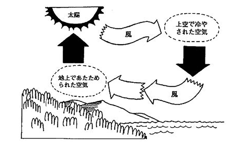 例えば、海岸地域では昼間に陸地が太陽光で暖められ、大気中の温度が上昇します。これにより、高温・低密度な空気が上昇し、その後ろには相対的に冷たい海面から発生した高密度な冷たい空気が流入してきます。この現象によって生じた局所的な強風は、「海風」と呼ばれ、多くの場合昼間に観察されます。