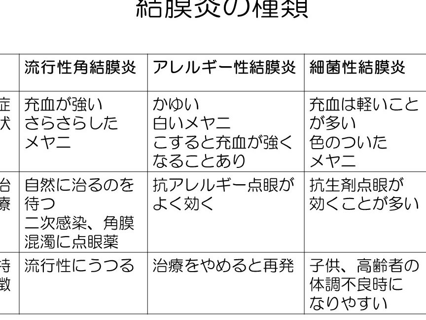 | ウイルス性 | 風邪などと同様に感染しやすく、水っぽい涙と強い赤みが見られる。 |