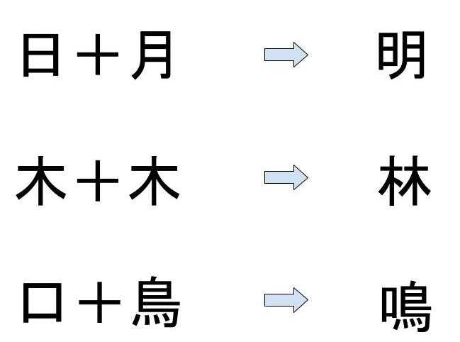 - 会意文字: 二つ以上の元素(他の漢字)を組み合わせて新しい意味合いを生む形式。
