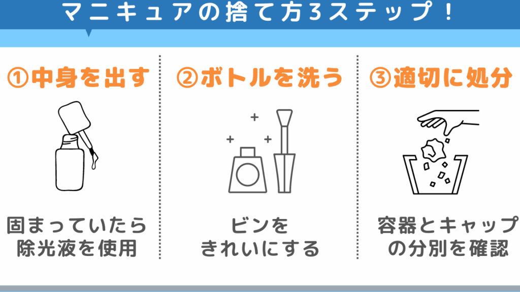 このように、「マニキュア どうやって捨てる?」という疑問について具体的な手順と注意点をご紹介しました。次回は廃棄物としての取り扱いについて詳しく見ていきましょう。