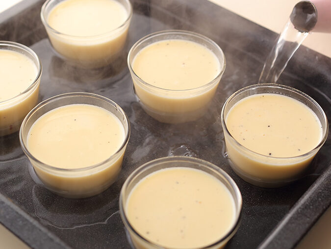 ここで大切なのはオーブンでの焼成方法です。予熱したオーブン(約160℃)に水浴び(バニュア・マリー)方式でカップや型を置いて約30〜40分間焼きます。この方法では、水蒸気によって均一な熱が伝わり、プリンがふんわりと仕上がります。途中で様子を見ることで焦げ付きや過剰な膨張防止にも繋がります。